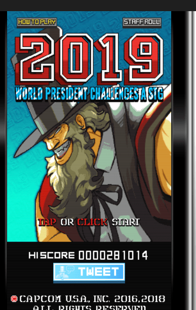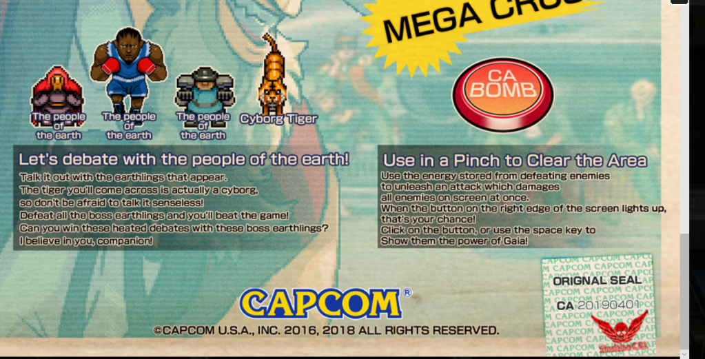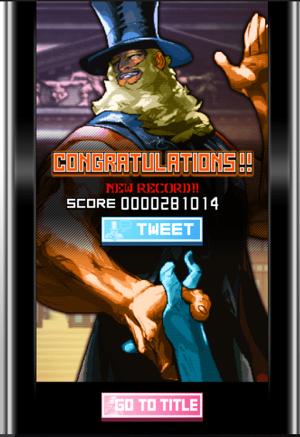 The game itself is pretty simplistic shoot ’em up fare. G is the protagonist, and in his word, he is on a mission to “debate” Shadaloo through killing all of their henchmen and eventually the devas themselves. You fight Balrog (Boxer), Vega (Claw), and Sagat in the first three levels (in this game called rounds) and then face the final boss, M. Bison (Dictator). The game is simplistic, but not easy, and I died many times against Balrog in the first level. After finally getting through the first level, I got the hang of the game and breezed past Vega and Sagat easily (thanks, W Shot!). I finally got to the final round, got to M. Bison, and died many more times. His patterns were somewhat unpredictable, but finally, I used my CA bomb as a last resort and finished him off! And… that was it. I got to the congratulations screen and was met with this.
