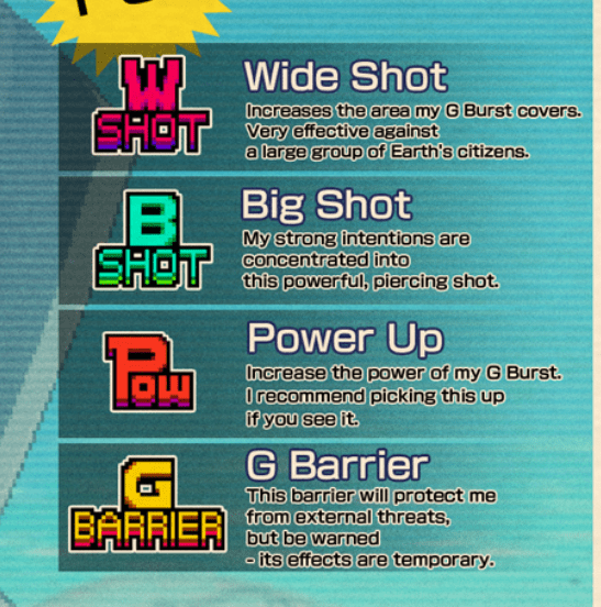 In the second screenshot, you see the power-ups he can acquire: Wide Shot, which shoots three G Bursts at a time; Big Shot, which fires single, more powerful G Bursts; Pow which increases the power of his G Burst; and G Barrier, which protects him from enemy attacks.