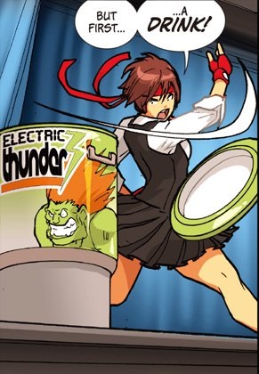 Yep, that’s Blanka on the side of the cup. As you can see, with this and Chun-Li (and several other characters) being in the Puzzle Fighter parody game, Udon unleashed the Easter eggs in this comic. It fits with Street Fighter’s brand, as the game is very self-aware and leans on the fourth wall quite a bit. However, with the series being genre savvy, there’s an unintended consequence – the self-awareness is canon.