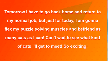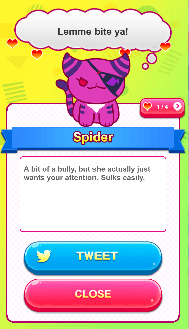 Even so, I looked deeper into the game, and some elements began to stand out to me, mostly from the gameplay aspect. The developers clearly took their time with this game, adding in aesthetics like multiple quotes per cat and adding hearts around said quotes every time you re-caught a cat. In fact, there didn’t seem to be much to go on at all to write a single cohesive theory on, as the backstory and design of the cats in the game were directly taken from their human counterparts, and the lore is already known.