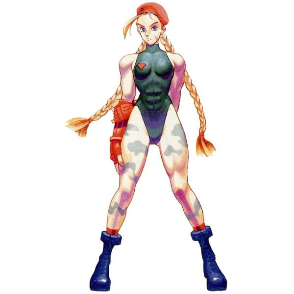 It’s Cammy. Her first appearance in Street Fighter II: the New Challengers revealed a design that would remain a staple throughout her many appearances in Capcom games: her green unitard, red gauntlet-like gloves, and blonde braids. There was one part of her design that made her stand out among others in the cast of II, though: the green camouflage paint on her legs. In lieu of pants, the developers opted to make her bare-legged, and likely added the paint to make her look more interesting. this became one of Cammy’s most ubiquitous features up until her appearance in V, where she does not wear paint at all in her default costume.