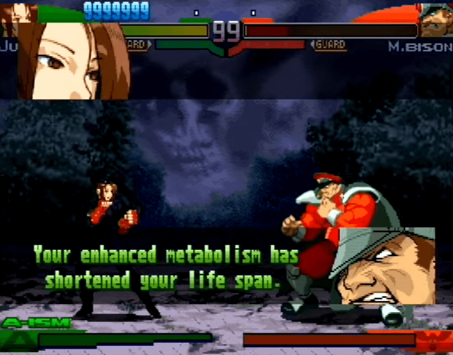 With the exception of Bison (and to an extent Ed and Falke, who are able to utilize it as a force for good), no one can use Psycho Power without heavy consequences. Birdie and the Shadaloo soldiers get severely weakened, and as seen in her ending above, Juli’s life is shortened because of her “enhancements” (and perhaps, the other Dolls as well).