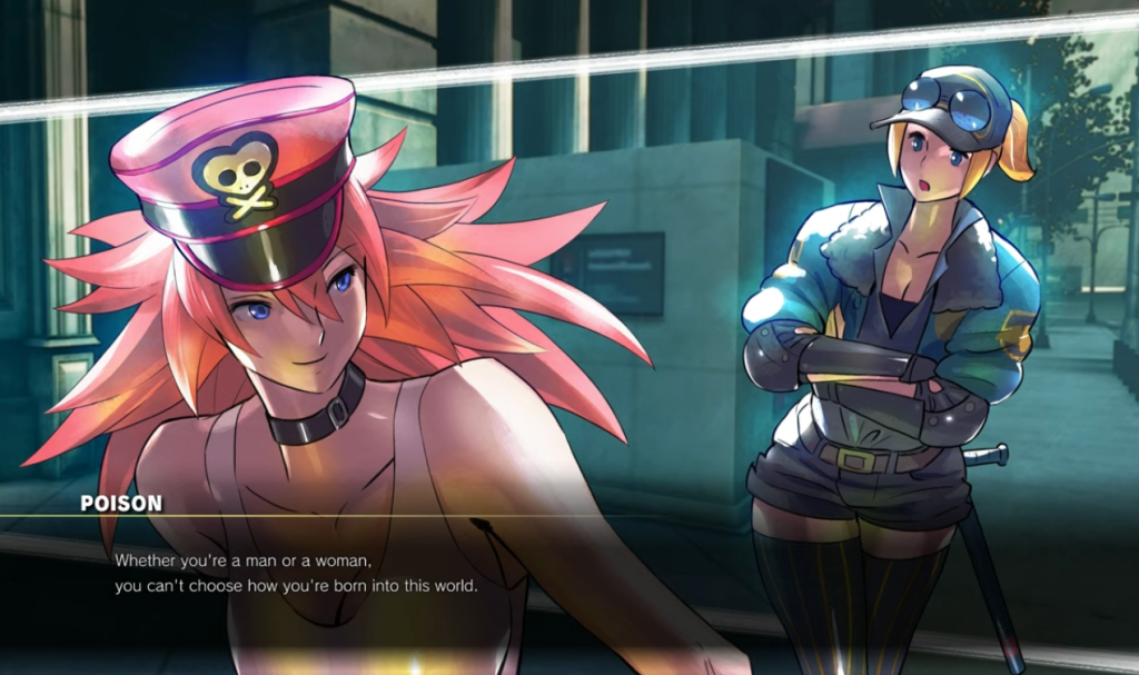 Their developers, however, aren’t taking the company’s route. According to Final Fight director Akira Nishitani, “the characters were originally planned to be cisgender women, but were changed to “newhalfs” (a Japanese slang term for trans women) after the game’s release, due to the suggestion that “hitting women was considered rude” in America and the concern that feminist groups would sue.” However, Nishitani has flip-flopped several times since, stating that Poison “could be male” but that it was up to the fans to decide, then stated that he felt that Poison is a woman, but is transgender in the United States and cisgender in Japan.