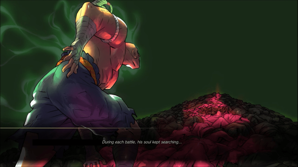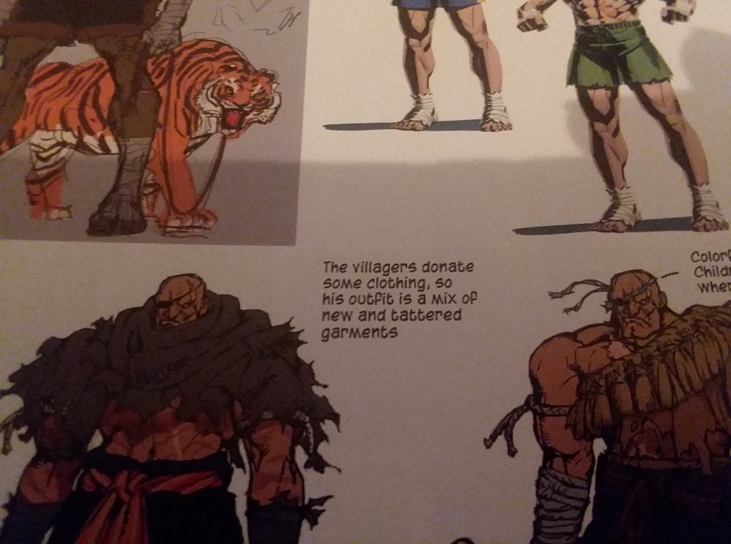 Based on the look and color of the scars, it’s possible they’re fresh, especially compared to the scar that Ryu made which is far darker in color. If this is the case, it tells me that he received the scars shortly before he arrived at the village. Where did he get them from? Sagat’s concept art profile states, “His body is covered in scars from training and his fights.” However, the character design book “How To Make Capcom Fighting Characters” proposes another idea.