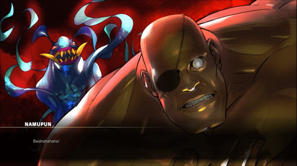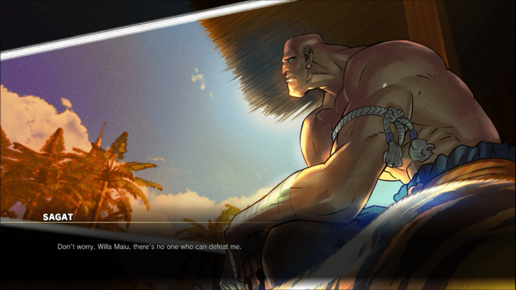It can be said that Sagat is a “what you see is what you get” character, much like several other characters in the roster like Rainbow Mika, Zangief, Dhalsim, and Abigail. There isn’t really a nagging mystery behind him. We’ve known his story since Street Fighter 1: he’s a Muay Thai master who was the best at what he did, lost a match to Ryu in which he received the scar on his chest, joined Shadaloo to seek revenge, left Shadaloo because he disagreed with their methods, and now spends time meditating and honing his skills in a secluded Thai village. Sagat’s story is one of change and redemption, and his character development is one of the most dramatic in the series.