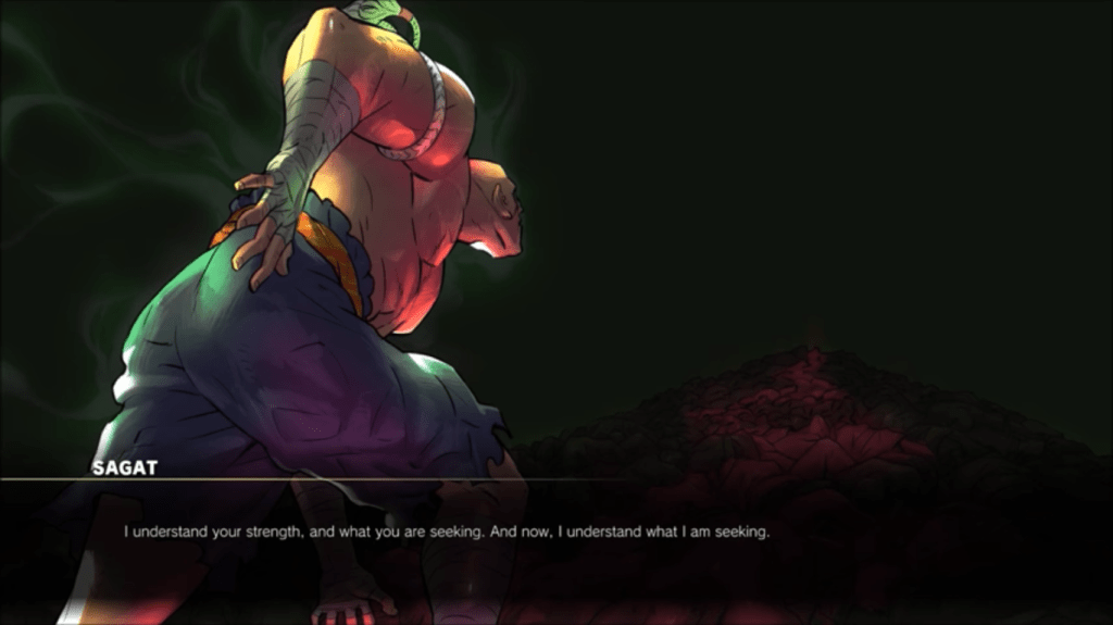 This is where Sagat’s true conflict comes from. Sagat’s fight is with his own ego. After being humbled by Ryu, then humbled by the people of his village, Sagat is struggling to stay humble. His ego won’t let him, and the fight is so strong that, with Psycho Power being the final push, it awakened the Satsui no Hado within him.