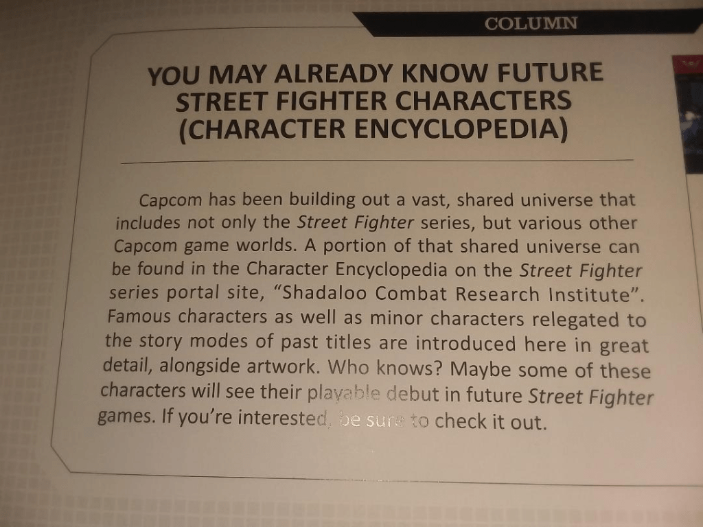 This little blurb, a small detail in a very detailed book, is pretty easy to miss if you’re skimming through How to Make Capcom Fighting Characters, but there it is on page 21. This tells you everything you need to know about what Capcom is planning for the future. The character profiles on the Shadaloo Combat Research Institute have always given clues to what characters are officially canon to the Street Fighter universe, and explicitly state when they’re not. https://game.capcom.com/cfn/sfv/column/list/cat4763