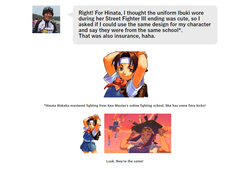 I’ve stressed the importance of Ibuki’s story for the past few years. Now things are becoming more fleshed out. Hinata’s designer, Hideaki Itsuno, mentioned in an interview that he liked the design of Ibuki’s school uniform so much that he wanted to use it for Hinata. Moreso, he states that, just like Sakura being made playable in Rival Schools as insurance that it sold, he believed that making sure Hinata and Ibuki had the same uniform and attended the same school would ensure the game became popular.