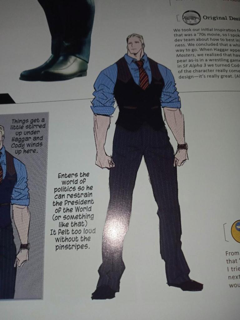 As seen in How to Make Capcom Fighting Characters, Cody’s design was meant to counter G’s – saying he went into politics “to restrain the President of the World” is a dead giveaway to what Cody’s future is going to be, and it will involve G in some way. So, if we assume this is the case, what can Street Fighter V tell us about what Capcom has planned for the story between Cody and G?
