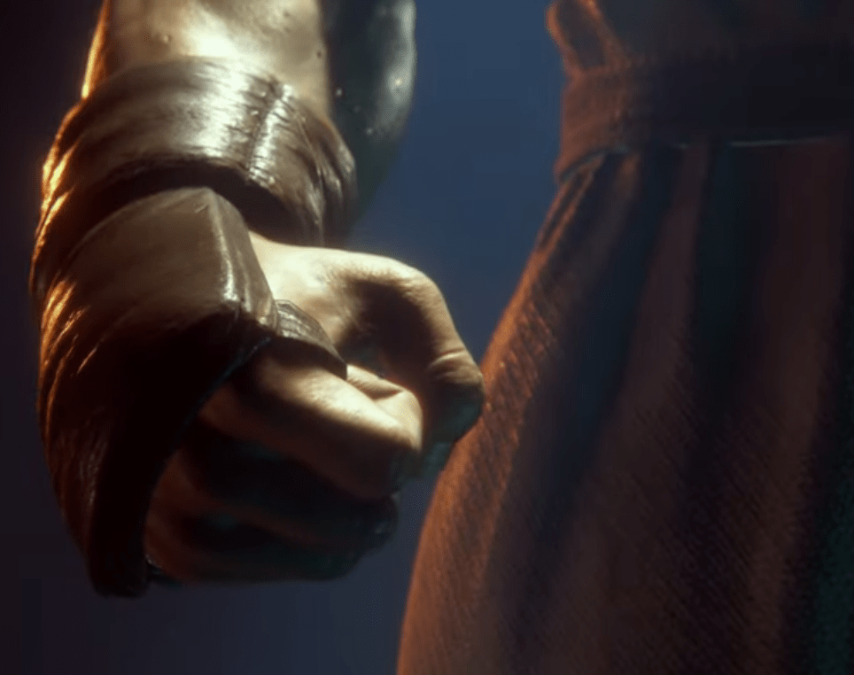 The trailer opens up with Ryu, who looks older and retains his beard from his Hot Ryu costume. However, there’s something noticably different about him – his uniform has changed. He retains his classic red headband, but he is now topless with a white binder around his stomach, is wearing brown pants and, most shockingly, has footwear.