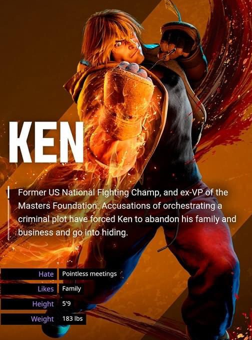 Well, then. What could this possibly mean? As the PlayStation Blog points out, Ken is trying to clear his name, and his attacks are inspired by his said quest. https://blog.playstation.com/2022/09/15/street-fighter-6-new-world-tour-battle-hub-details-four-legendary-faces-join-the-roster/